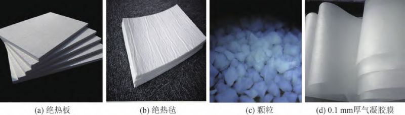 高速列車因運行環境變化大、時速高、廂體夾層空間狹小,設計時青睞于高性能(如保溫隔熱、防火防爆、減振吸能、隔音降噪等)材料。二氧化硅氣凝膠復合材料具有輕質、絕熱、隔音、阻燃、疏水以及環保等優異性能,在未來高速列車車體優化設計中具有廣泛的潛在應用價值。目前主要的二氧化硅氣凝膠復合制品有絕熱板、絕熱氈、涂料、膜、顆粒、紙和異形件等,部分復合制品如圖3 所示。