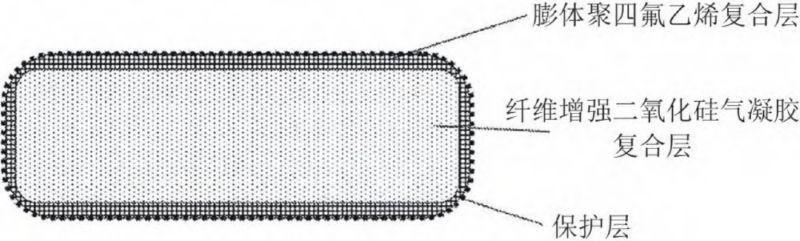 二氧化硅氣凝膠與玻璃纖維、陶瓷纖維或者碳纖維等復合后得到氈類制品,雖隔熱效果較好,但是表面纖維容易斷裂、粉化,造成浮纖或粉末污染。為解決該問題,可將氣凝膠復合層的外部覆蓋一層更高強度、高韌性的材料,如膨體聚四氟乙烯和阻燃聚對苯二甲酸乙二醇酯纖維的復合層,如圖7 所示。