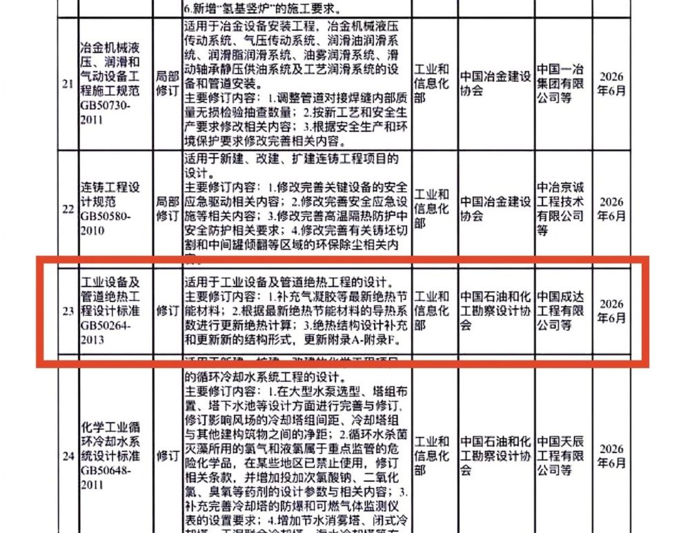 日前,住房城鄉(xiāng)建設部印發(fā)建標函〔2024〕41號文“關于印發(fā)2024年工程建設規(guī)范標準編制及相關工作計劃的通知”,下達了GB 50264-2013《工業(yè)設備及管道絕熱工程設計標準》國家標準修訂計劃,項目由中國成達工程有限公司等單位牽頭,計劃要求于2026年6月完成。